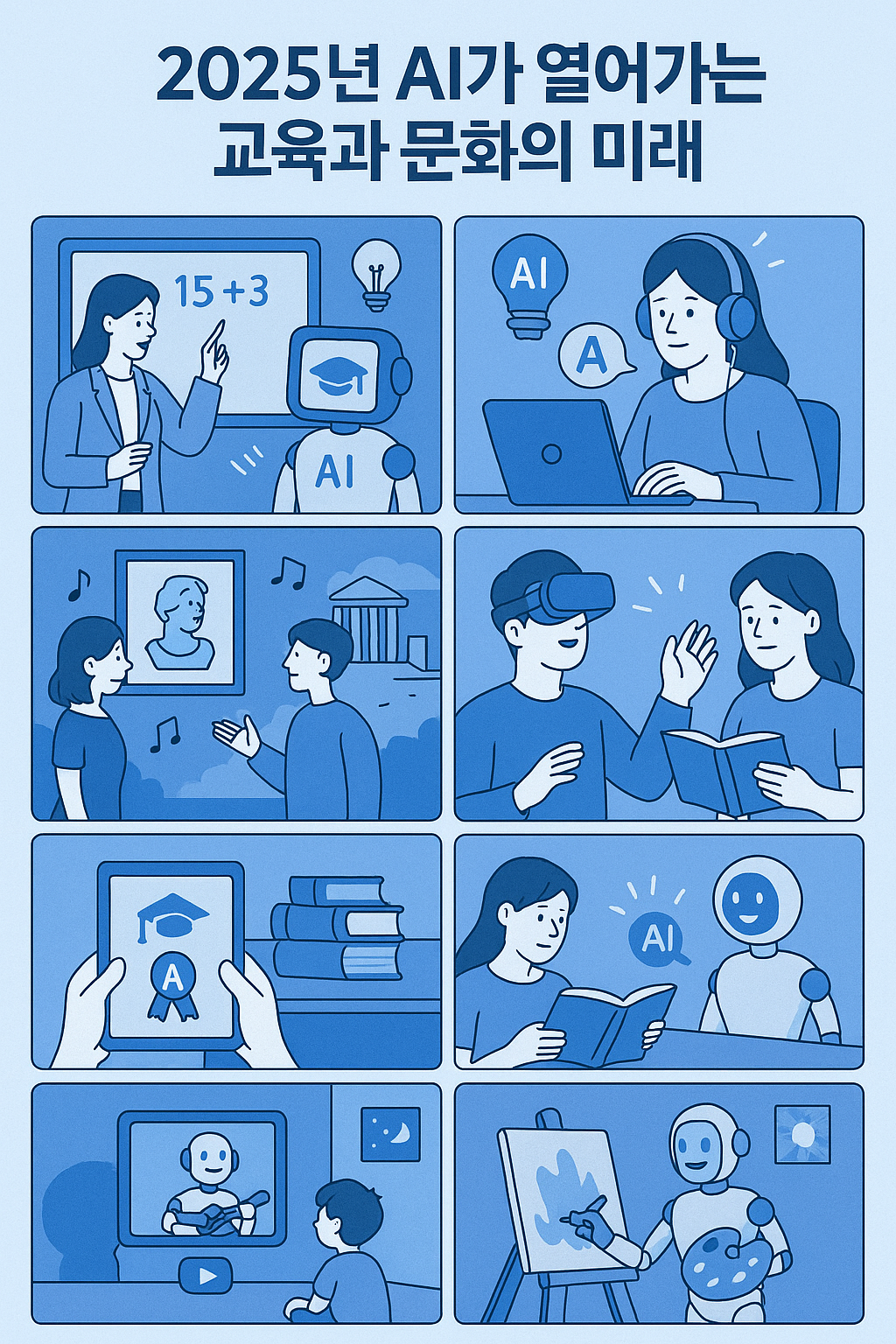 2025년 AI가 열어가는 교육과 문화의 미래는 단순한 변화가 아니라 새로운 가능성의 문을 여는 과정입니다. 기술은 학생들의 학습 방식부터 사람들의 문화 생활까지 깊숙이 들어와 새로운 흐름을 만들고 있습니다.